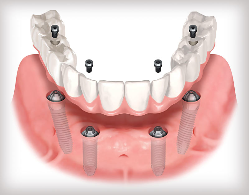 - Four strategically placed implants to securely support a full set of upper or lower teeth